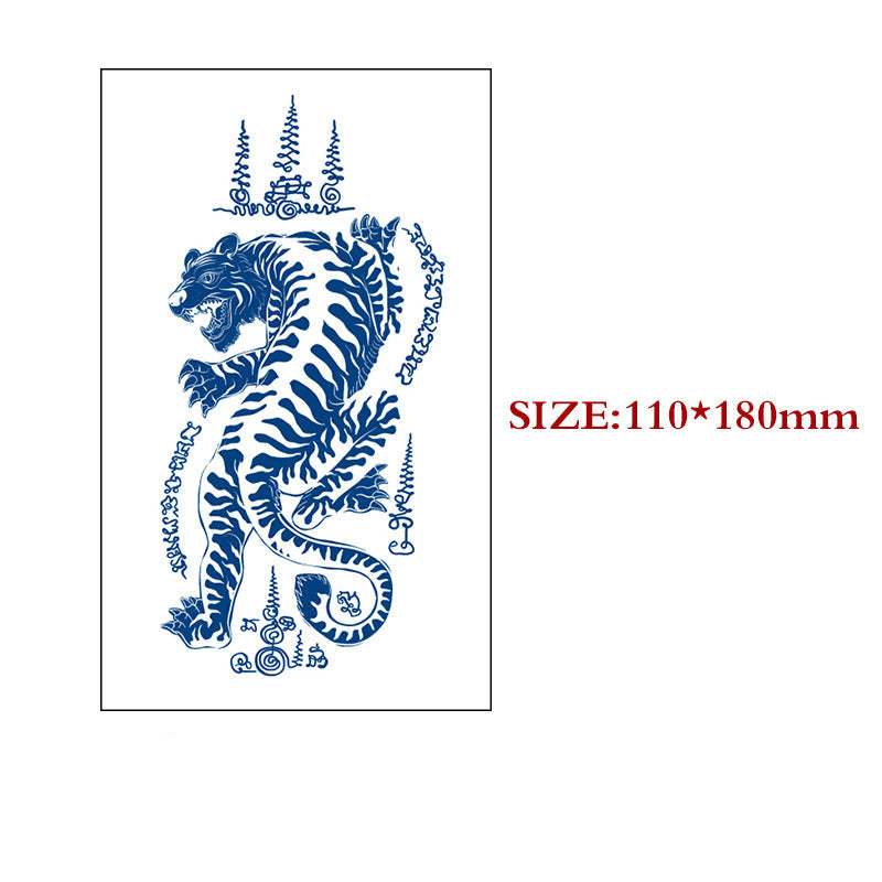 Channel ancient energy with Tiger's Curse โ a bold semi-permanent tattoo featuring a prowling Thai-style tiger surrounded by protective Sak Yant script. This sacred-inspired design brings fearless protection, wild spirit, and cultural depth into a 4x7 inch masterpiece. Whether you're drawn to traditional Southeast Asian tattoo styles or just love a tiger with meaning, this design captures it all.